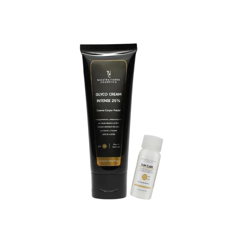 - Incluye: 1 Crema Intensiva Ácido Glicólico 25% Peeling de 100grs REGALO: 1 Sun Care Sensible 20ml Una crema que brinda un peeling intensivo en casa diseñada para proporcionarte una piel más radiante, uniforme, lisa, firme y luminosa (Glow Skin). Transforma tu piel con esta fórmula avanzada que combina ácido glicólico al 25%, ácido mandélico, gluconolactona y bisabolol. El ácido glicólico al 25% promueve una renovación celular acelerada que reduce eficazmente las manchas oscuras, las zonas con hiperpigmentaciones, atenúa estrías, mejora la textura de la piel, dejándola más suave, uniforme y radiante, mientras que el ácido mandélico y la gluconolactona actúan suavemente para unificar el tono, mejorar la textura, reducir las arrugas y mejorar la hidratación. GLYCO CREAM INTENSE tiene un pH que brinda un perfecto equilibrio entre la eficacia del tratamiento y la tolerancia de la piel. Además, está adicionada con bisabolol, un ingrediente que calma la piel y reduce la inflamación, asegurando que tu piel se mantenga hidratada y confortable durante el tratamiento. Ideal para quienes buscan una transformación visible, pues deja tu piel radiante, uniforme y rejuvenecida. Su sensorial es suave y exquisito, no es pesada ni molesta, ya que está libre de aceites, haciéndola compatible con todo tipo de pieles. Se puede aplicar en rostro y cuerpo. Presentación: Frasco con 100grs Beneficios: