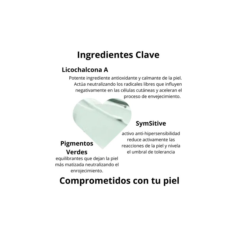 Antienrojecimiento, Calma la Piel, Mejora la textura, Protege la piel, Regula la sensibilidad de la piel, neutraliza el tono de la piel, tiene FPS 30 + protección UVA