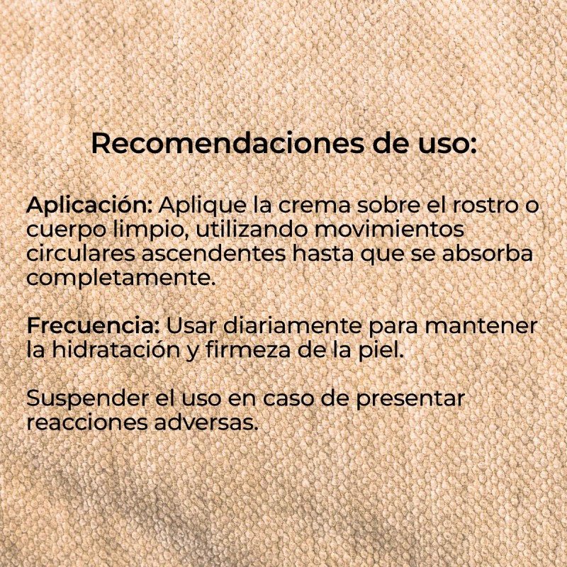 Aplique la crema sobre el rostro o cuerpo limpio, utilizando movimientos circulares ascendentes hasta que se absorba completamente. Usar diariamente para mantener la hidratación y firmeza de la piel. Suspender el uso en caso de presentar reacciones adversas.