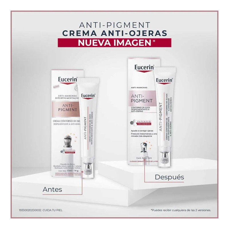 Eucerin Anti-Pigment Crema Anti-Ojeras combina potentes ingredientes activos que actúan de diferentes maneras para potenciar la luminosidad de la piel y reducir la hiperpigmentación, además de iluminar y suavizar el contorno de los ojos desde su origen. Su fórmula fresca y ligera contiene: Thiamidol, un ingrediente eficaz y patentado que actúa en la raíz de la hiperpigmentación ayudando a reducir la producción de melanina, en la superficie de la piel. Pigmentos que reflejan la luz para iluminar el contorno de los ojos y conseguir un aspecto despierto y fresco al instante. El Ácido Hialurónico ayuda a reducir las bolsas en los ojos y suaviza las líneas de expresión. Los Oligopéptidos estimulan la red de colágeno de la piel para conseguir una estructura dérmica más firme. Modo de uso: Colocar una pequeña cantidad de producto en el aplicador de metal y aplicar en el contorno de ojos.
