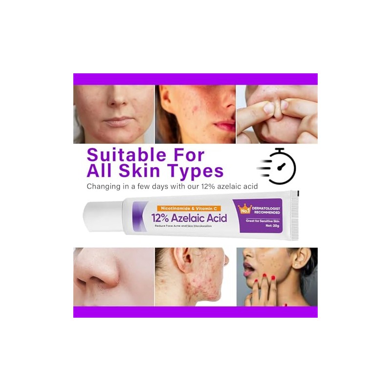 Descripción del producto: Presentamos nuestro suero de ácido azelaico al 12 % con ácido hialurónico y niacinamida, diseñado específicamente para tratar y reducir las manchas oscuras y el acné rosácea. Esta fórmula única ayuda a equilibrar la producción de sebo e hidratar profundamente la piel, lo que la convierte en un complemento esencial para su rutina de cuidado de la piel. Ideal para personas con piel sensible, esta crema de ácido azelaico garantiza que su cutis se mantenga claro, suave y radiante sin riesgo de irritación. Beneficios de los ingredientes clave: 1. Ácido azelaico: conocido por su capacidad para reducir el acné y las manchas oscuras, el ácido azelaico actúa destapando los poros y refinando la textura de la piel. Es particularmente eficaz para personas con piel sensible o propensa a la rosácea, ayudando a mejorar la apariencia general de la piel. 2. Ácido hialurónico: este poderoso humectante hidrata profundamente la piel, ayudando a mantener los niveles de humedad al tiempo que previene la producción excesiva de grasa. Favorece un acabado mate equilibrado que mantiene su piel con un aspecto fresco durante todo el día. 3. Niacinamida: También conocida como vitamina B3, la niacinamida es esencial para mejorar la elasticidad de la piel, mejorar la función de barrera, igualar el tono de la piel y disminuir la opacidad. Funciona sinérgicamente con el ácido azelaico para brindar mejoras visibles en la textura y el tono de la piel. Cómo usar: 1. Preparación: Comience con el rostro limpio. Use un limpiador suave para eliminar la suciedad, la grasa o el maquillaje. 2. Aplicación: Aplique una pequeña cantidad del gel de ácido azelaico en el rostro, centrándose en las áreas propensas al acné o las manchas oscuras. Masajee suavemente la piel con movimientos circulares ascendentes. 3. Absorción: Deje que el suero de ácido azelaico se absorba completamente en la piel antes de aplicar cualquier producto adicional o maquillaje. 4.