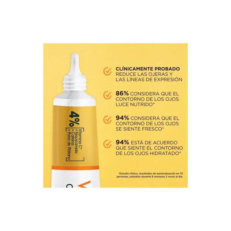 Eficacia clínica comprobada contra las ojeras, líneas finas y opacidad de la piel del contorno de ojos. Poderosos activos con 4% [vitamina c, niacinamida, cafeína y polvo de banana].
