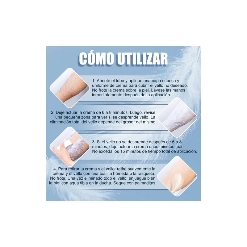 {Modo de uso} 1.Aplica una capa uniforme sobre la zona deseada con la piel limpia y seca. 2.Deja actuar entre 5 a 10 minutos, según el grosor del vello. 3.Retira el producto con una espátula o toalla húmeda, comprobando que el vello se desprenda fácilmente. 4.Enjuaga con agua tibia y seca la piel suavemente sin frotar. 5.Aplica una crema hidratante para calmar la piel y evitar irritaciones.