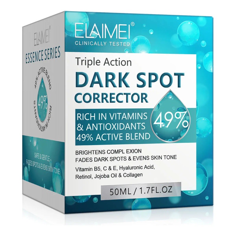 - Beneficios Recupera la uniformidad y luminosidad de tu piel con la Crema Correctora de Manchas Oscuras Elaimei. Su fórmula de triple acción contiene un 49% de ingredientes activos que combinan antioxidantes, vitaminas y agentes despigmentantes para reducir visiblemente las manchas oscuras, hidratar profundamente y mejorar el tono general del rostro. Con una mezcla avanzada de vitamina B5, C y E, ácido hialurónico, colágeno, aceite de jojoba y retinol, esta crema ayuda a restaurar la textura natural de la piel mientras combate los signos visibles de envejecimiento. Ideal para piel con hiperpigmentación, manchas solares, manchas por acné y tono desigual. Ayuda a reducir manchas oscuras y marcas Mejora el tono y la luminosidad de la piel Hidrata profundamente sin sensación grasa Restaura la elasticidad y suavidad Protección antioxidante contra el envejecimiento Apta para rostro, cuello y escote Características Contenido: 50 ml Tipo: Crema facial correctora Uso recomendado: Día y noche Textura: Ligera, rápida absorción Ingredientes clave: Vitamina B5, C y E Ácido hialurónico Retinol Aceite de jojoba Colágeno No comedogénica Libre de fragancias fuertes Apta para piel mixta, grasa o seca Presentación en envase compacto y fácil de aplicar Modo de uso o recomendaciones Limpia y seca tu rostro antes de aplicar Aplica una pequeña cantidad de crema en las áreas deseadas Masajea con movimientos circulares hasta que se absorba por completo Usa dos veces al día, mañana y noche, para mejores resultados Aplica protector solar durante el día para evitar que reaparezcan manchas Evita el contacto con los ojos. No aplicar sobre heridas abiertas. Si presentas irritación, suspende su uso. Llamado a la acción Despídete de las manchas oscuras y saluda a una piel visiblemente más uniforme, hidratada y luminosa. La Crema Correctora de Manchas Elaimei es tu aliada ideal para lucir un rostro renovado, suave y con tono equilibrado. Ideal para incluir en tu rutina diaria de cuidado facial. Preguntas frecuentes ¿En cuánto tiempo se notan los resultados? Generalmente a partir de la segunda semana de uso constante, con resultados más visibles al mes. ¿Puedo usarla en piel sensible? Sí, aunque se recomienda probar primero en una pequeña zona. ¿El producto sirve para manchas de acné? Sí, está formulado para tratar marcas y manchas post