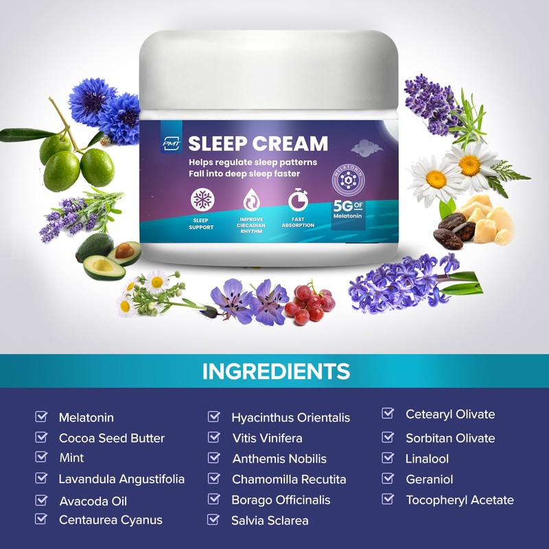 Sleep Cream by PMT, Natural Sleeping Aid Regulates Sleep Patterns to Fall Asleep Faster,Uses Natural Ingredients Melatonin & Lavender,Improves Circadian Rhythm for All Ages,Scented Night Cream-2.83 Oz