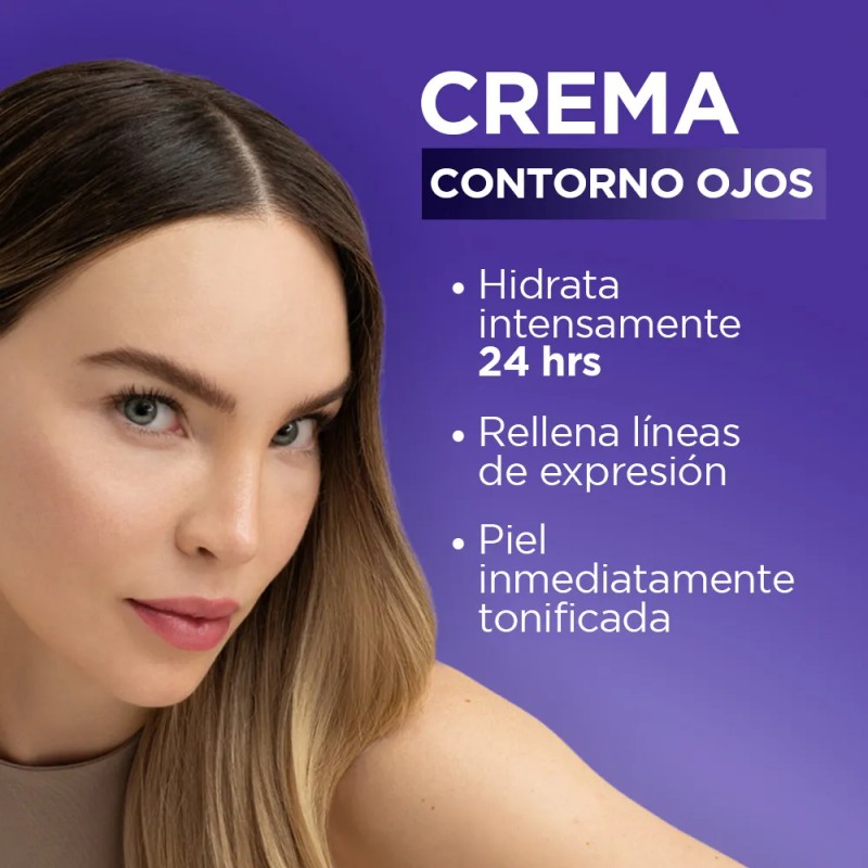 Crema para ojos Revitalift de L'Oréal Paris, diseñada para el cuidado intensivo del contorno de los ojos. Enriquecida con Ácido Hialurónico, ayuda a rellenar las líneas de expresión y cuenta con protección solar FPS 20. Ideal para mujeres a partir de los 30 años y probada por dermatólogos.