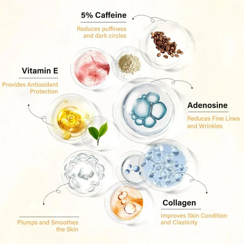 - Crema de ojos con cafeína Hidratante para ojos Características de la crema para ojos: 1. Sérum para ojos con cafeína: este suero para ojos está formulado con cafeína, un poderoso ingrediente conocido por su capacidad para reducir la hinchazón y las ojeras alrededor de los ojos. Disfruta de unos ojos frescos y revitalizados con nuestra crema hidratante e hidratante. 2. Hidratación: nuestro sérum para ojos proporciona hidratación y nutrición a las delicadas zonas del contorno de los ojos. La potencia de los ingredientes ayuda a retener la piel, dejando una sensación suave y flexible. ¡Di adiós a los ojos secos y cansados! 3. Reducción de la hinchazón y la oscuridad: dile adiós a la hinchazón y las ojeras debajo de los ojos con nuestro sérum para ojos con infusión de cafeína. La combinación de cafeína y otros ingredientes activos mejora la circulación, reduce la apariencia de hinchazón e ilumina la zona debajo de los ojos. 4.