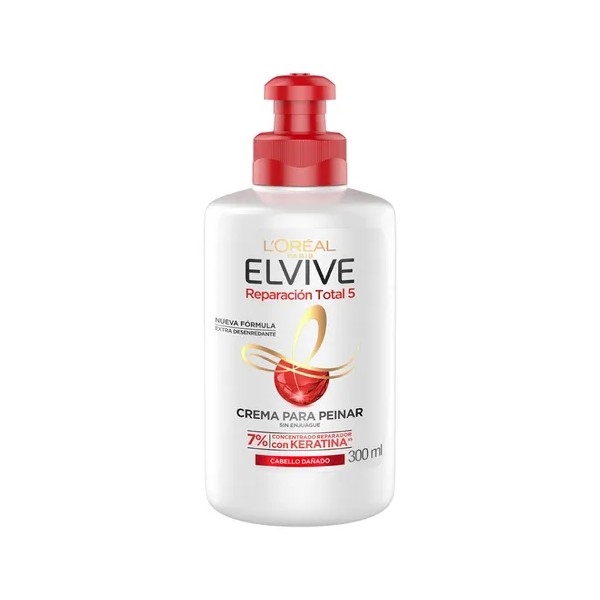 Crema para peinar Elvive Reparación Total 5 con 7% de concentrado reparador con Keratina XS y sin sal para cabello dañado.