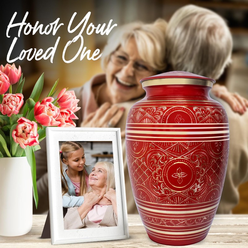 - High quality & durable red urn for ashes: This beautiful funeral gold large urn for human ashes adult male & female is solid and made of high-quality metal with a shiny finish. The intricate ash urn adult design is handmade by highly skilled craftsmen using traditional, time-honored techniques. Rest assured, this exquisite red urn for ashes for women large will serve as a poignant symbol of remembrance for your loved ones.