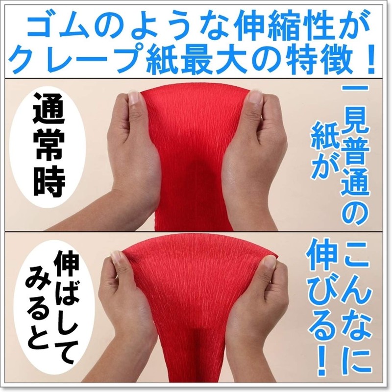 - Features crepe paper that is stretchy Special processed drapes make the paper stretchy so the paper stretches like rubber. Stretches to a length of 6.9 ft (2.5 m). Texture: Hard material that will not lose its shape after being shaped. It may feel stiff