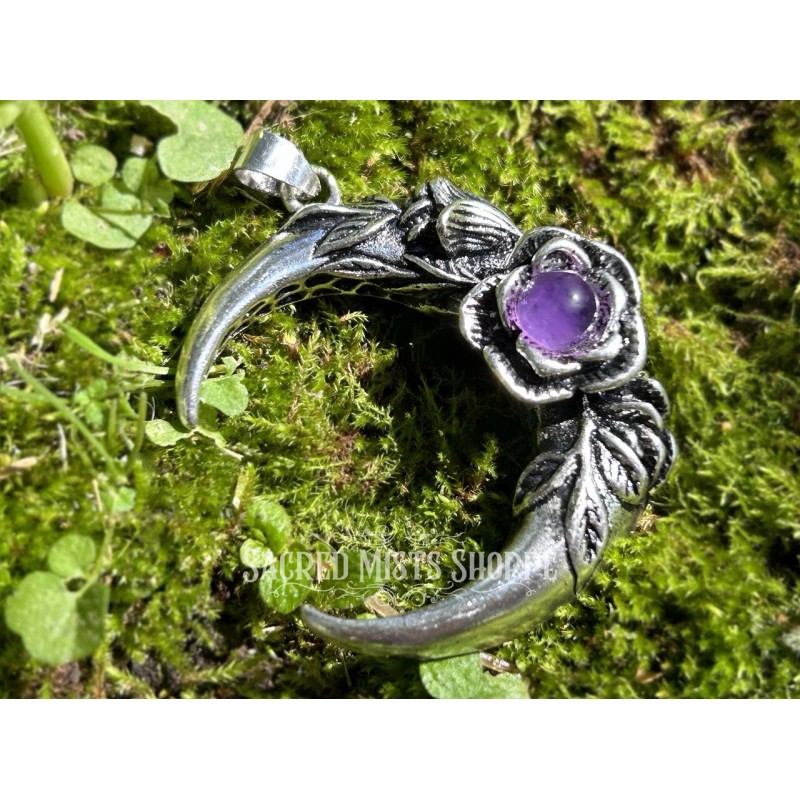 Crescent Moon & Rose Pendant w Amethyst Serenity Healing Harmony Calming Harmony