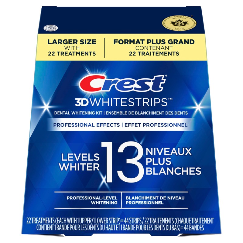 Want to whiten your teeth at home? Try Crest 3DWhitestrips Professional Effects. This teeth whitening treatment is designed to whiten like a professional-level whitening treatment, with a comfortable, no-slip whitening experience. The Advanced Seal Technology’s no-slip grip means the strips stay put until you take them off, allowing you to talk and even drink water while whitening your teeth. Crest 3DWhitestrips Professional Effects has been validated by the Canadian Dental Association and uses the same whitening ingredient as dentists. Get a 100% noticeably whiter smile, guaranteed. This enamel safe at-home teeth whitening kit will make your smile 13 levels whiter in just 22 days. Simply apply Crest 3DWhitestrips Professional Effects for 30 minutes a day for 22 days. This pack includes 44 teeth whitening strips, 22 for your top teeth and 22 for your bottom teeth, to be used over the course of 22 days
