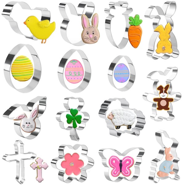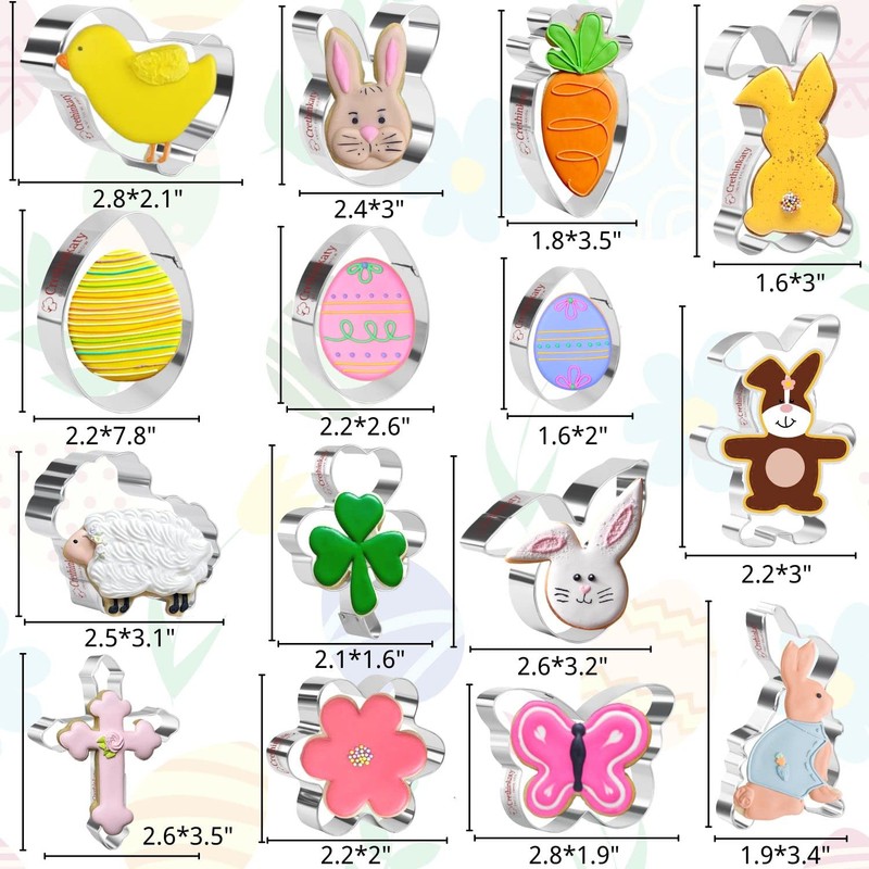 Crethinkaty Easter Cookie Cutter Set - 15 Pieces Stainless Steel Holiday Cutters for Baking - Rabbit, Chick, Egg, Carrot, Clover, Butterfly, Sheep, Cross and Flower