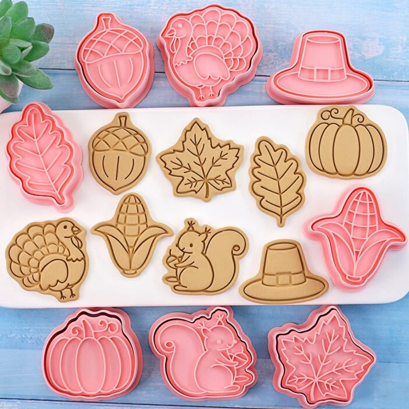 Crethinkaty Thanksgiving Cookie Cutters-8Pieces Thanksgiving Cookie Cutters and Stamps,Plastic Thanksgiving Cookie Cutter Set,Pumpkin, Turkey, Maple Leaf, Oak Leaf,Squirrel,Corn,Acorn and Hat