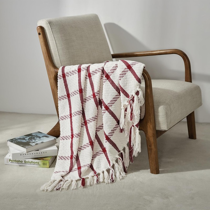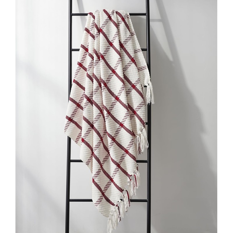 CREVENT 127cm x 152cm Farmhouse Breathable Soft and Warm Chenille Throw Blanket for Sofa Couch Bed Home Decor Throw with Tassels (Red and White)