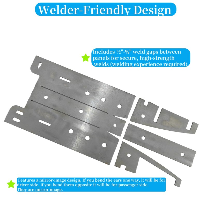 - Easy Installation – Features a mirror-image design, If you bend the ears one way, it will be for driver side, if you bend them opposite it will be for passenger side. They are mirror image. You will need to grind your frame minimally to get the best fit possible. When you bend them correctly they will slide up and stay by themselves for you or your welder to install. Welding Required – Must be welded by someone with welding experience (grinding off mill scale before welding is necessary). Designed with ½"-⅝" gaps between pieces for proper frame welding