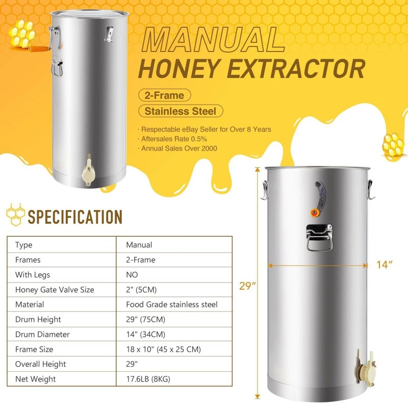 - HEFTY CAPACITY: The central drum on this 4-Frame honey extractor is 24" tall and 20" in diameter - the perfect size for extracting bulk honey quantities at one time.