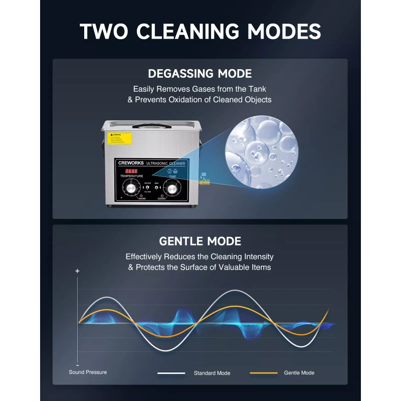 This industrial-strength ultrasonic cleaner is built to outperform and outlast the competition with its reinforced stainless steel tank walls, perfectly gentle yet thorough 40kHz sound wave cavitation, and handy control knobs. The degas and gentle cleaning modes are specifically engineered to protect your delicate and valuable items.