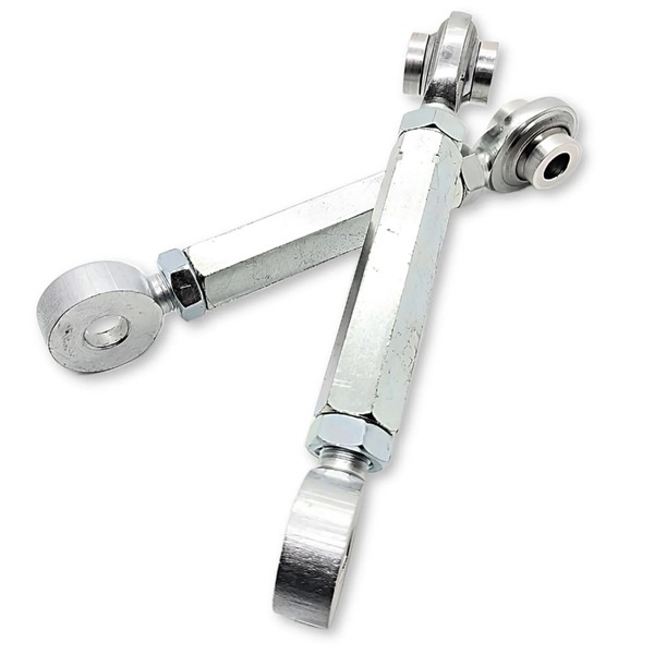These fully adjustable lowering links can transform the rear of the motorcycle to any height between factory and lowered 3 inches (75 mm). This is perfect for anyone who needs just a little more of their feet touching the ground at intersections and on slopes, or for that "lowered stance" look. To change ride height, simply turn the center hex adjuster. Our links are the same thickness as the stock links, which means the stock bolts and nuts are retained and the locking element of the nuts will be engaged. Made of steel, they have large, ½ inch diameter threads and are silver zinc coated for strength and corrosion resistance. We do not use aluminum threads.