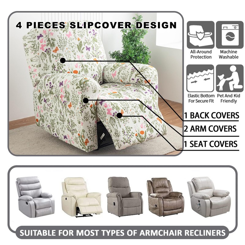 CRFATOP Printed Recliner Cover with Pockets Single Reclining Slipcover 4-Pieces Lazy Boy Recliner Sofa Chair Cover with Elastic Bottom for Recliner Furniture Protector for Kid Pet,A18