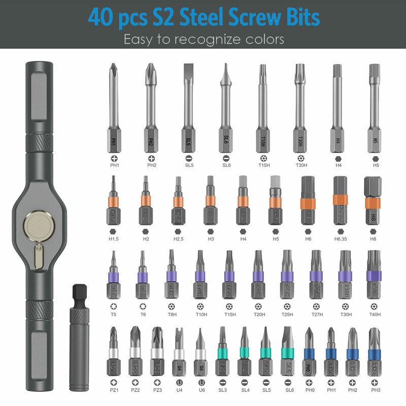 - 【Easy Identification and Magnetic Slot Design】The screwdriver set comes with an intuitive colored ring for quick bit identification, enhancing productivity. The handle includes a powerful magnetic compartment that increases bit magnetism, securely holding the bit in place for fast and efficient use. This design not only makes it easier to find the right bit quickly but also ensures that the bit stays in place during use, reducing the risk of losing it or having to stop and search for it