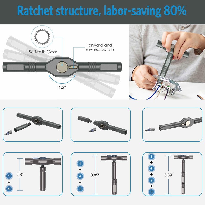 - 【Effort-Saving Ratcheting Design】The ratchet screwdriver in the kit features a 58-tooth forward and reverse ratchet construction, a 6.2° ratchet force-saving design, and a torque of 50 N.m/50 KG, which saves up to 80 % of effort when tightening or loosening screws. You don't have to keep adjusting your wrist to get the job done, saving you valuable time and energy. Whether it's a quick DIY project or a larger repair job, this feature makes the job more efficient