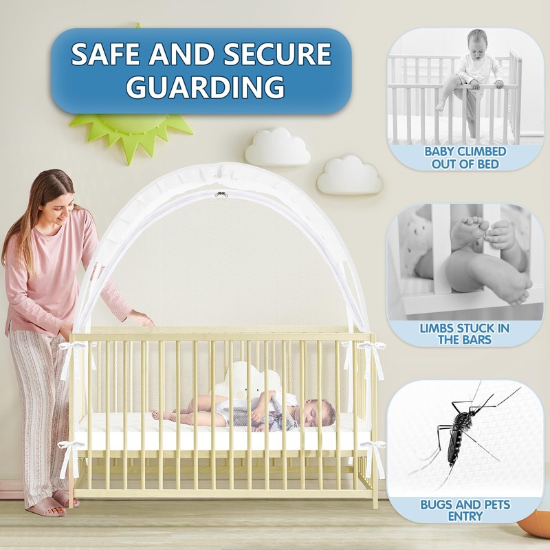 Crib Tent - Crib Net to Keep Baby in, Stop Baby from Climbing Out of Crib, Pop Up Baby Crib Tent with Double Zip Strong Rods and Breathable Net Clear Visibility Easy to Install (White, Large)