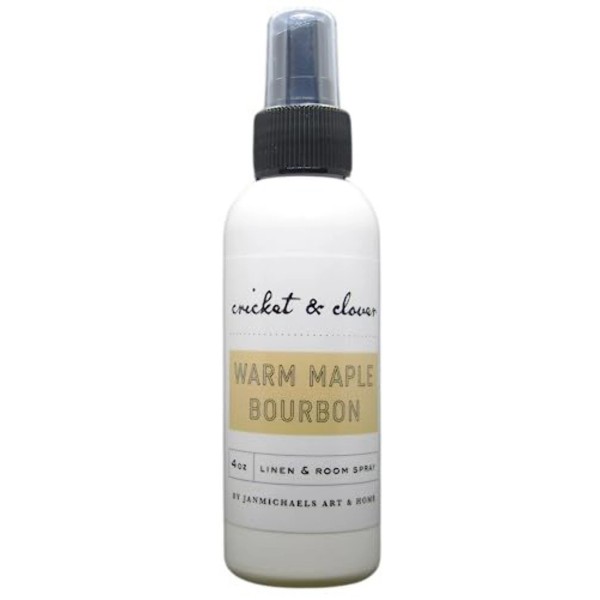 Scent Note Profile: Top Note: Chilled Whiskey Accord, Vanilla Essence, Lemon Peel Middle: Vermont Maple Syrup Accord, Damask Rose, Amber Blooms Base: White Cedarwood, White Tonka Beans, Frosted Musk Lovely Warm Maple Bourbon Scent. Great to freshen up the house or car and bring the fragrance of a man shed or bar inside! 4 oz plastic liquid spray bottle Made in amish country Lancaster PA USA Perfect for Spring, Summer, Winter or Fall/Autumn Nestled in the heart of Pennsylvania Dutch Country, Jan Michaels is a family owned and operated company focused on farmhouse styles and vintage inspired framed artwork, home decor, gifts and accessories. Cricket & Clover is our home fragrance and candle line made with the finest soy wax and natural fragrances. Each fragrance is inspired to evoke home and country life and the beautiful memories and events associated with it. Each Cricket and Clover Room and Linen Spray is handmade in small batches in Lancaster, PA. Freshen up any room, linen or car with our captivating Sunshine Grove scent. This is just one more way of enjoying our preferred candle aromas, but in a flameless way. A burst of freshness is guaranteed with each spray from the 4oz bottle. Scent Note Profile: Top Note: Chilled Whiskey Accord, Vanilla Essence, Lemon Peel Middle: Vermont Maple Syrup Accord, Damask Rose, Amber Blooms Base: White Cedarwood, White Tonka Beans, Frosted Musk. Each fragrance is inspired to evoke home and country life and the beautiful memories and events associated with it. Nestled in the heart of Pennsylvania Dutch Country, Jan Michaels is a family owned and operated company focused on farmhouse styles and vintage inspired framed artwork, home decor, gifts and accessories.Item Specifics