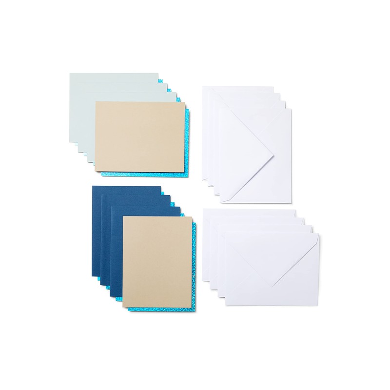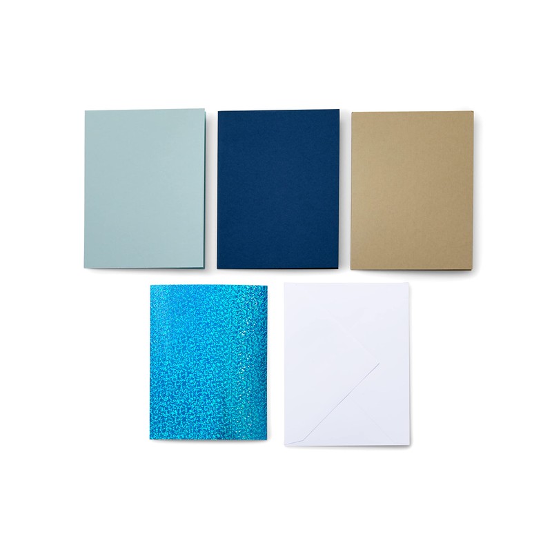 • 8 self-adhesive cards (3 Midnight Blue, 2 Khaki, 3 Whispering Blue) 8 Blue Holographic Backers, 8 White Envelopes