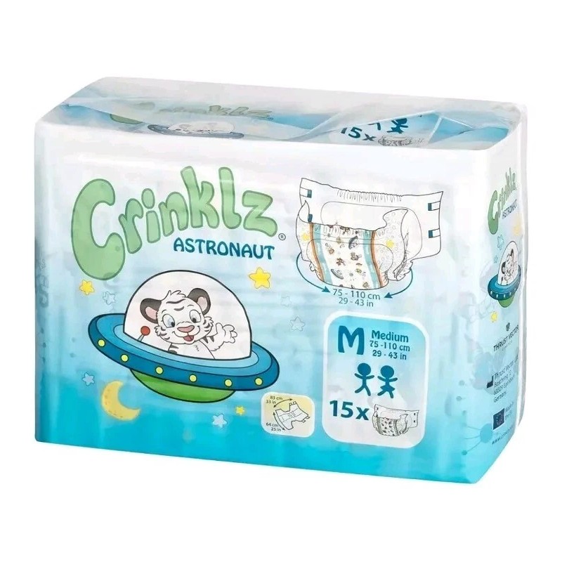 2 Pack sample of Crinklz Astronaut Adult Diapers Medium 29"-43". 4400ml capacity. ABDL Printed Plastic Backed.