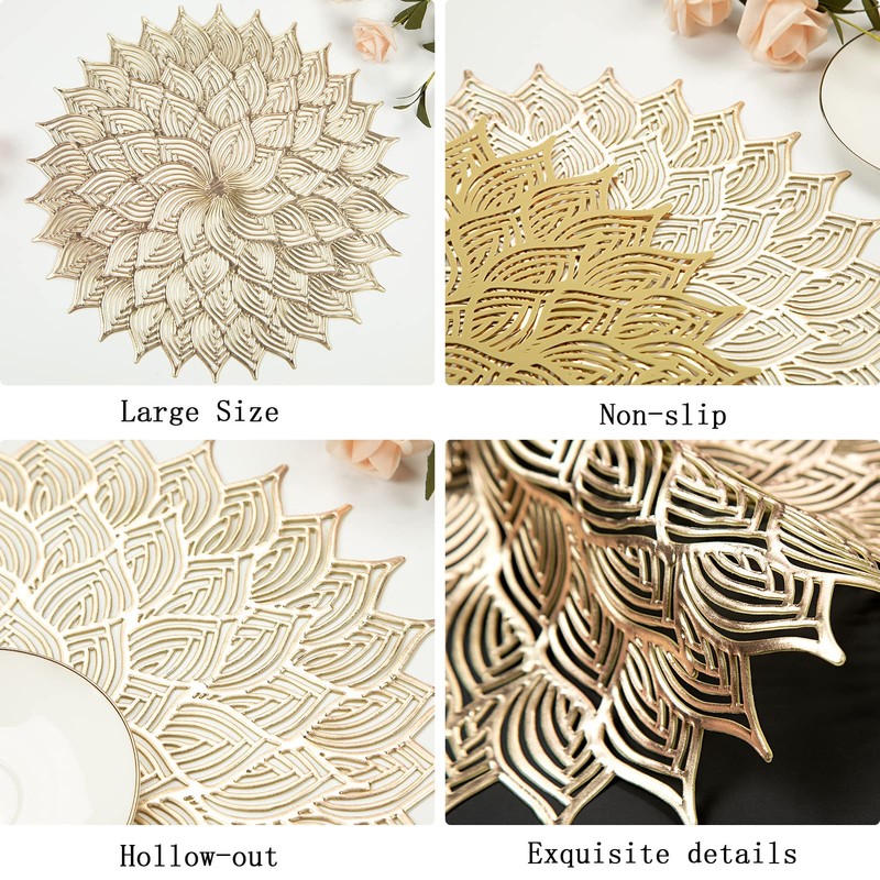 - Design:Hollow out flower leaf placemat,Stylish gold metallic placemats add a glamorous finishing touch to your table decor.especially For your Party parties,wedding receptions,birthday party dinner and so on.