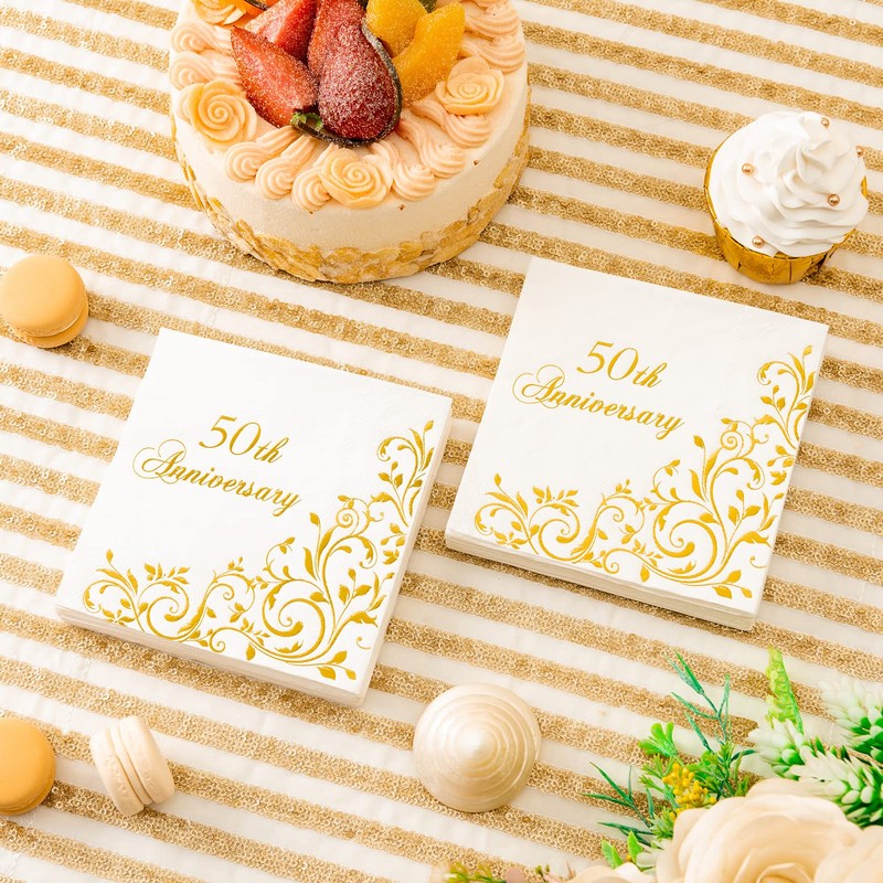 - Featuring a Gold theme with "50th Anniversary" imprinted with gold foil. Real gold foil design that shines in the light, these napkins will definitely enhance your table and impress your guests.