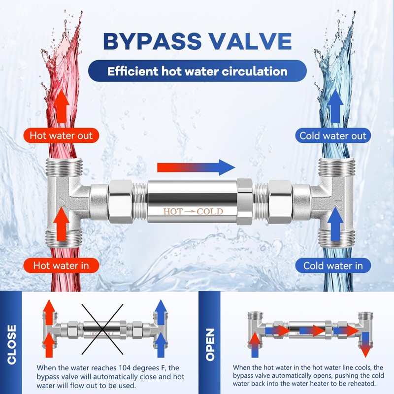 - Durable 304 Stainless Steel Bypass Valve:Upgraded from plastic to withstand high temperatures, the bypass valve opens to redirect cool water back to the heater when the hot water line temperature drops below 104°F. This reduces wait times and is compatible with single-loop systems. For multiple loops, additional sensor valve kits (sold separately) are required.