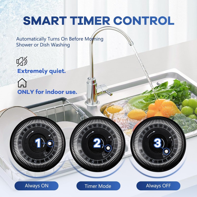 - Smart Timer Control:Programmable to automatically activate before morning showers or dishwashing, the control system operates quietly and mounts directly onto standard indoor tank water heaters for residential use.
