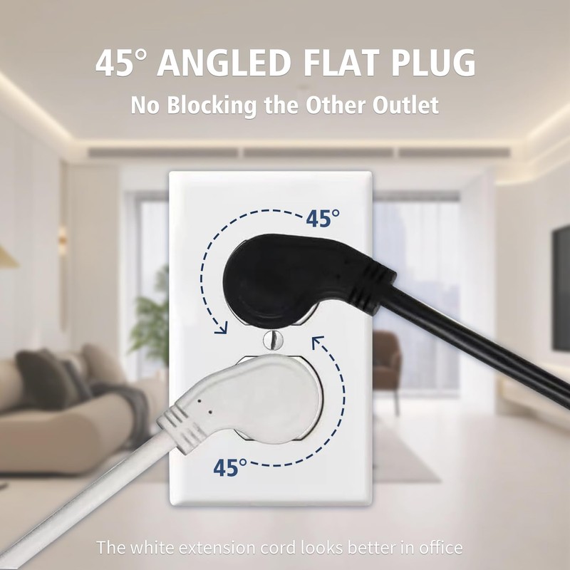 - Flat plug: Designed for small spaces, such as behind furniture, bookshelves, desks, or anywhere close to the wall where standard outlets cannot be used.