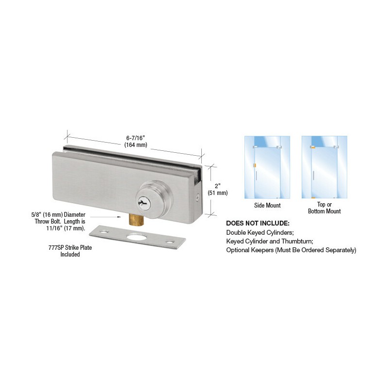 The CRL American Style Patch Lock can be mounted on the top or bottom of doors. It can also be used on the vertical edge of the door, and secured to a jamb with the Keeper that is supplied with the unit.NOTE: Cylinders not included. Must be ordered separately. COMES WITH: Template and Instructions DOES NOT INCLUDE: Double Keyed Cylinders; Keyed Cylinder/Thumbturn; Optional Keepers (Must Be Ordered Separately) |