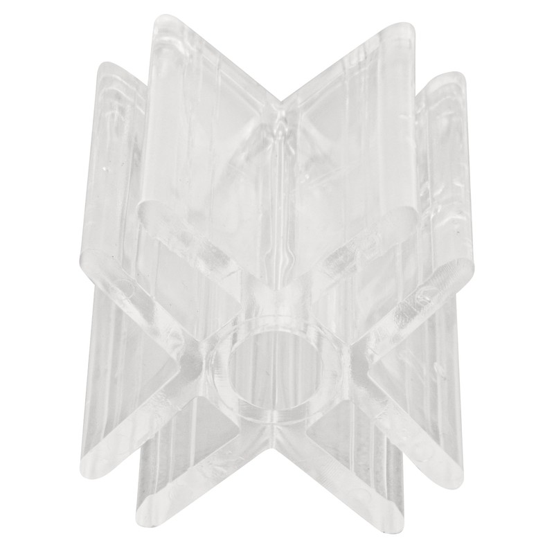 Create beautiful and functional glass display units with CRL Plastic Display Connectors that give retail stores or rooms a feeling of spaciousness. Four- Way 90 Degree Connectors are used for connecting four lites at 90 degree angles on display cubes. These clear plastic connectors hold 3/16 inch (5 millimeter) glass or mirror in an unlimited variety of configurations giving you design freedom to arrange and rearrange as you desire. Clear Plastic Display Connectors are easy to use. They go on simply with a tap of a soft- face mallet over 3/16 inch (5 millimeter) glass. Lay out cut glass panels, start from the base and work up. The full assembly can be up in minutes.