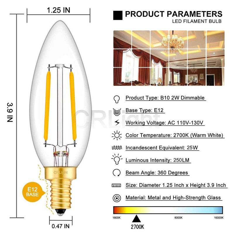 - ★ TECHNICAL FEATURES - Using high efficiency and large-size LED chips in filaments, full brightness is 250 lumens, input voltage is 110-130V, energy used is 2 watts, E12 candelabra base, with overload protection, short circuit protection and over temperature protection