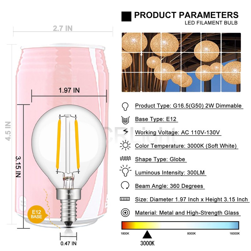 Product Type: G16 2W Dimmable LED Filament Bulb E12 Candelabra Base 3000K (8Pack)