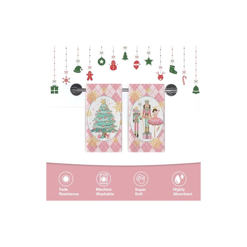 Croar Pink Christmas Tree Nutcracker Kitchen Dish Towels Set of 2, Xmas Gold Snowflake Drying Hand Towel Baking Cooking Cloth, Winter Holiday Diamonds Bathroom Home Decoration 18 x 26 Inches