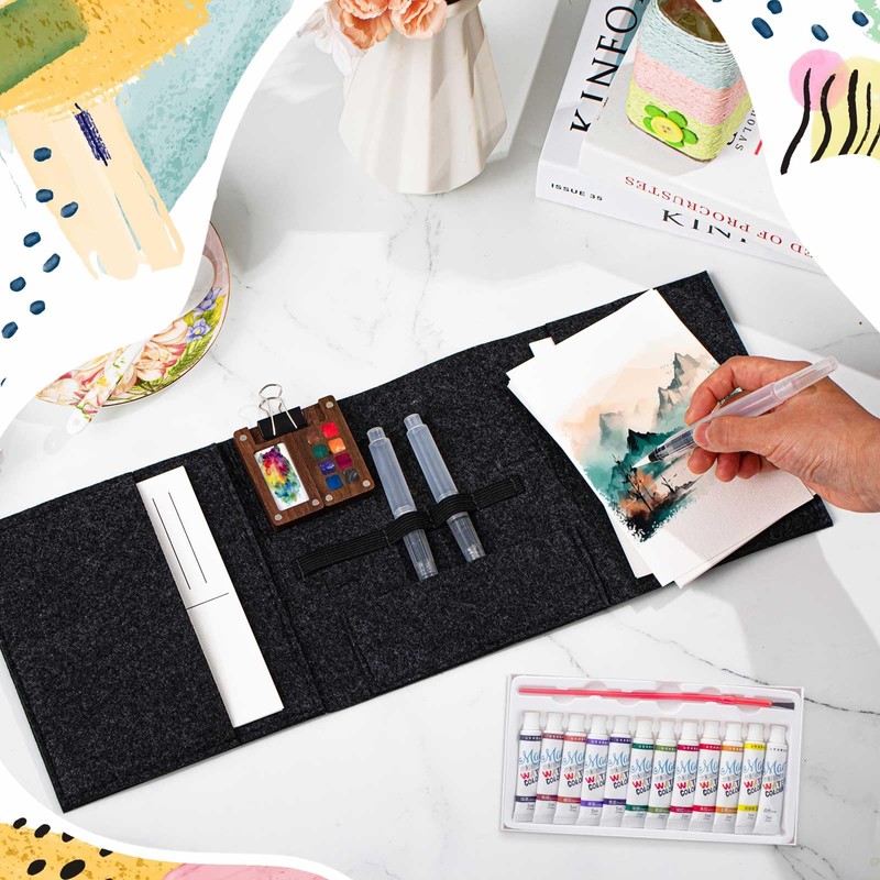 - Folding Felt Bag: the entire set of watercolor tools can be packed into a tri-fold felt bag; This bag is not only stylish but also practical, allowing you to carry your art supplies safely and compactly; The snaps on the surface ensure that the items are securely fixed