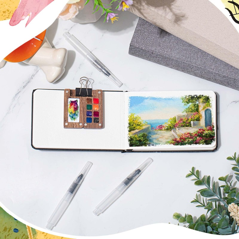 - Travel Watercolor Set: our package contains 41 pieces in total, including 30 watercolor postcards, 1 watercolor sketchbook, 3 travel watercolor pens, an 8-color walnut wood watercolor paint box, 4 clips, 1 travel watercolor carrying bag and a 12-color watercolor paint