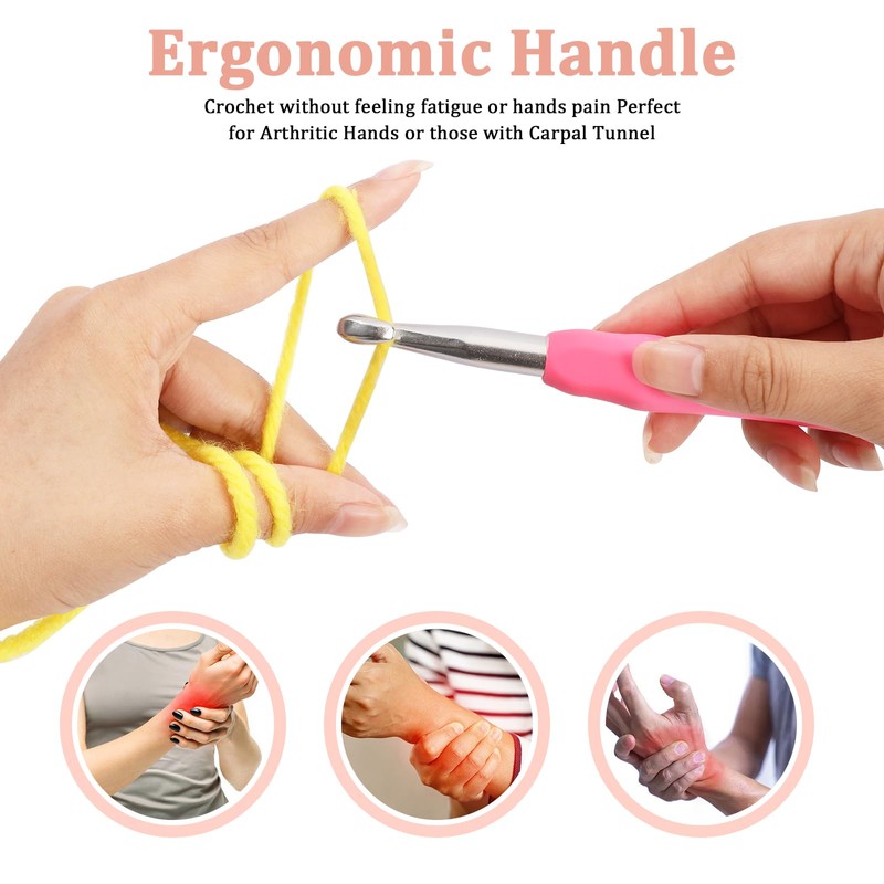 - [Reasonable Design]: Each crochet accessory is designed with a soft and comfortable handle, providing an ergonomic grip and reducing hand fatigue. You won't feel discomfort or hand cramps even if you crochet for a long time. Great for arthritis patients and beginners! Premium crochet ergonomic soft handle for beginners and experienced crochet enthusiasts!