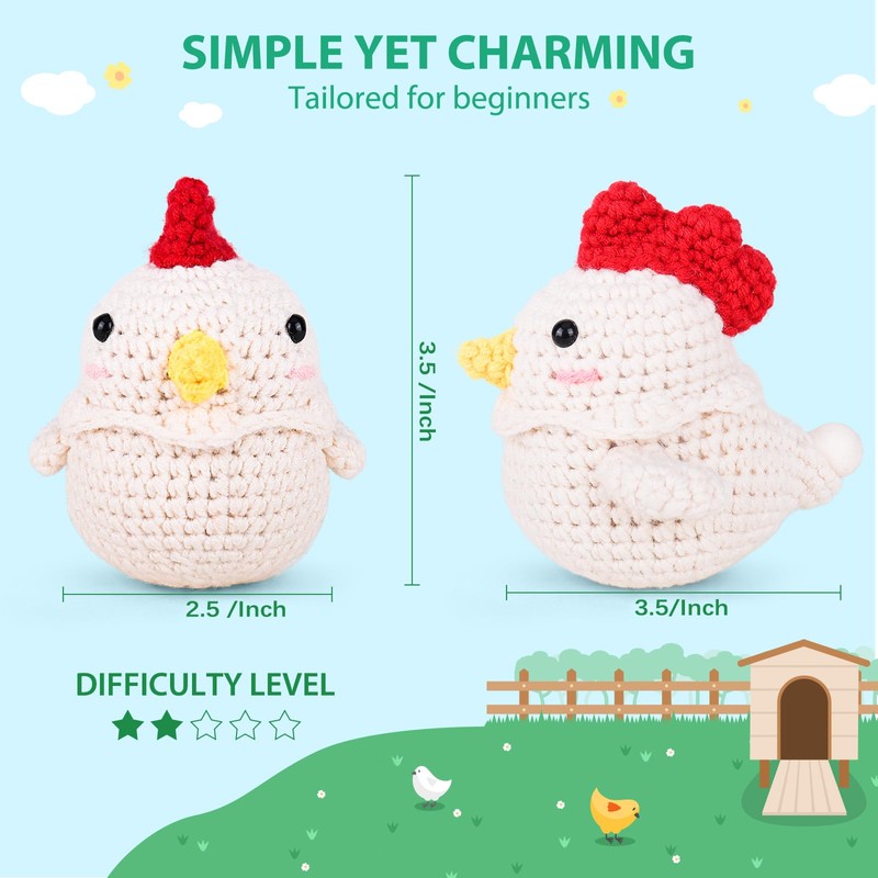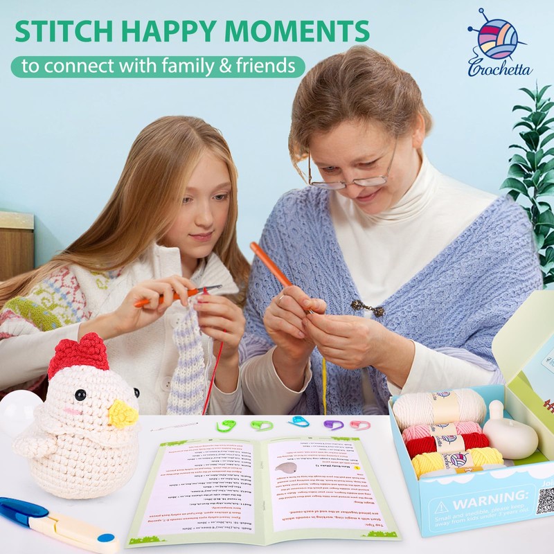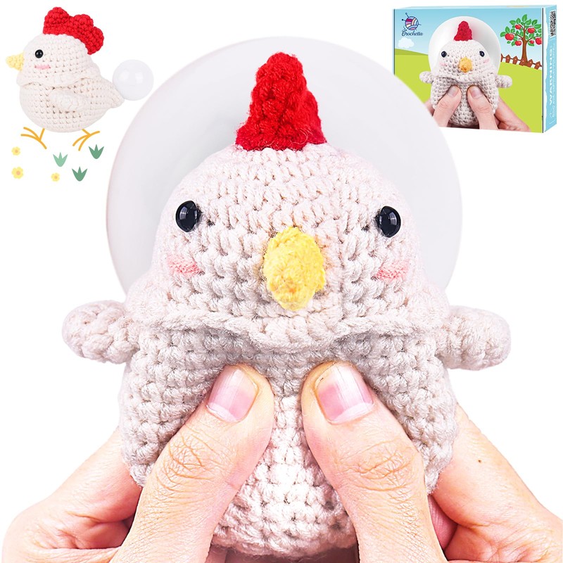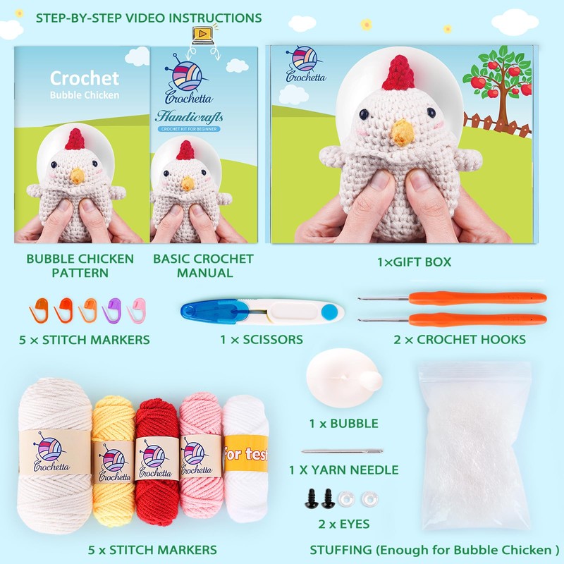 - All-In-One Crochet Starter Kit: CROCHETTA beginner crochet kit includes everything you need to start: 7 different colored yarns, ample stuffing, 1 needle, 2 eyes, 5 stitch markers, 2 ergonomic crochet hooks, 1 pair of scissors, 1 crochet chicken&eggs pattern manual, and 1 beginner's basic crochet manual.