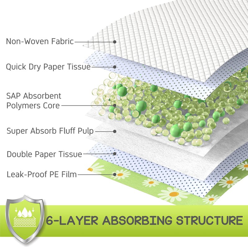 - 6-Layer Protection Design: Features a 6-layer construction with a 3D diamond quilted top for rapid absorption; super absorbent polymer core turns liquid into gel; leak-proof PE film prevents spills and leaks