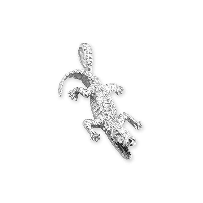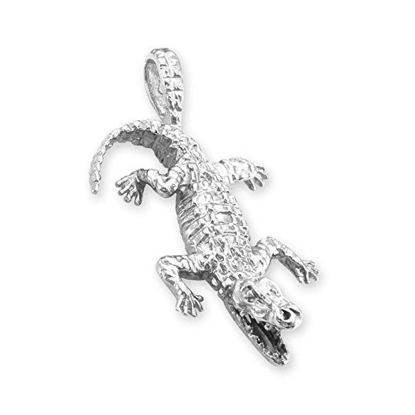 Here we have a lovely quality and really eye catching design of pendant. A fat bellied crocodile with a knobbly detailed back and open jaws ready to snap. A nice lifelike pose that hangs perfectly on a necklace especially with the scale patterning blending onto the bail as well.