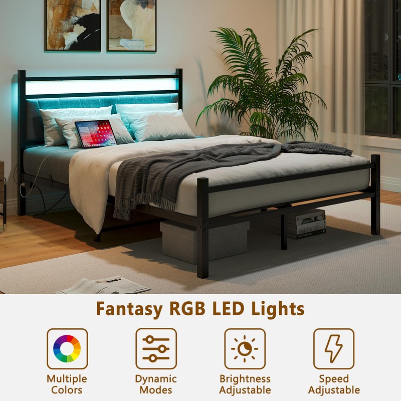 Crocofair Full Size Bed Frame with Upholstered Headboard and Charging Station, LED Lights Bed Frames with Under Bed Storage,Solid and Stable, Noise Free, No Box Spring Needed, Easy Assembly,Grey