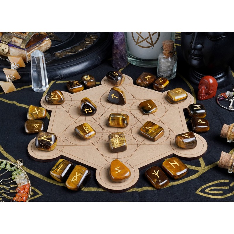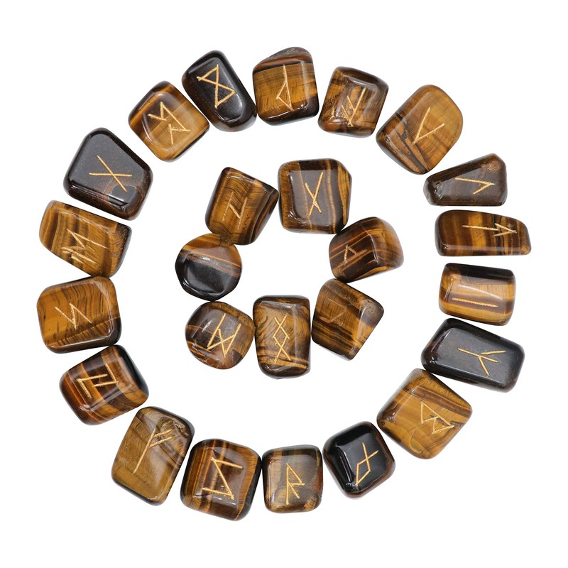 - ✨ Tiger Eye Gemstone Engraved Rune Stones: Feng Shui Tiger Eye Elder Futhark Alphabet Engraved Symbol (24 Engraved + 1 Blank) Rune Stones Size: 15-20 mm. Rune stones have been used for centuries as a tool for divination. Today, they are still used in magic and divination by many Pagans. They fall into the same category such as the tarot, Each rune stone is inscribed with a symbol and each symbol holds a special meaning.