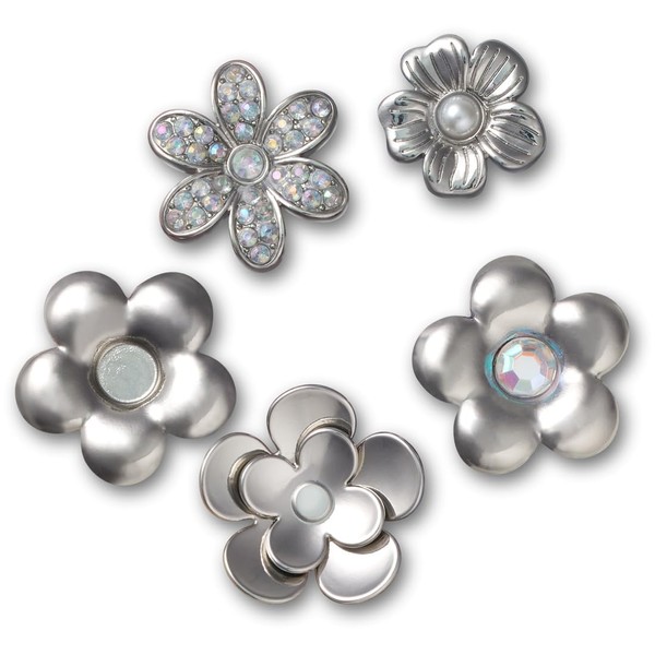Crocs Jibbitz Elevated Metal and Jewel Shoe Charms, Monochrome Silver Flowers, 5 Pack