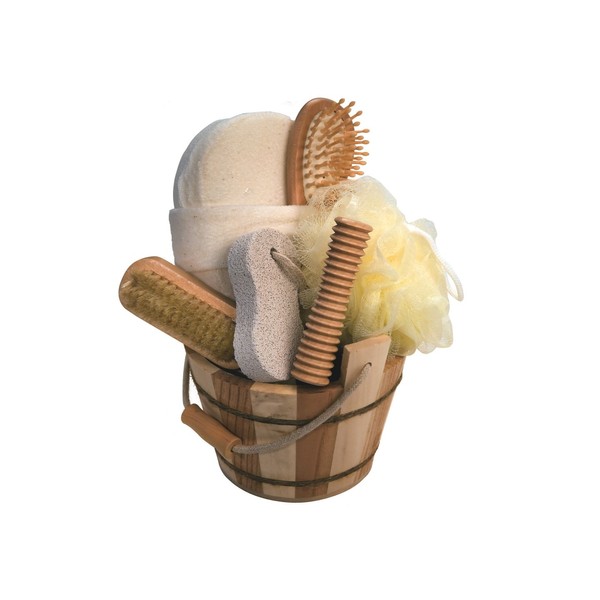 - Contents: Massage sponge, wooden massage roller, hair brush with wooden nubs, pumice stone, tulle sponge, nail brush with natural bristles.